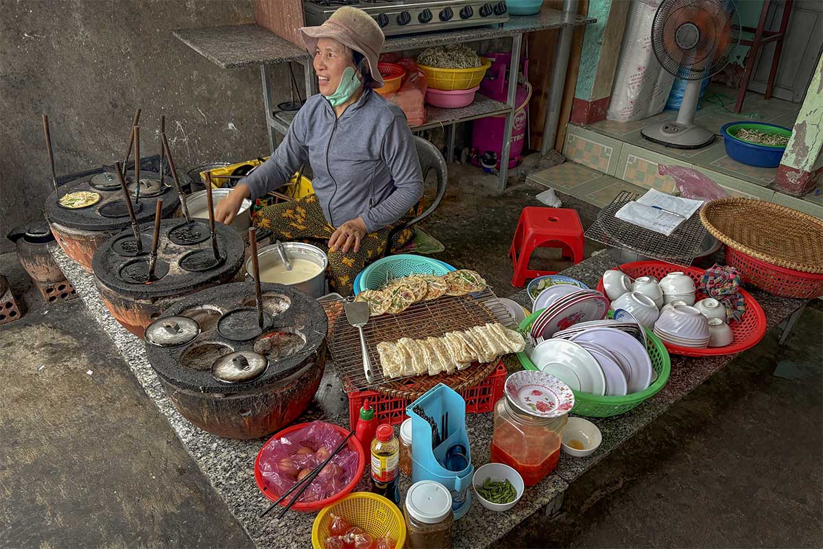 Local woman cooking banh xeo muc – Traditional squid pancakes being prepared on clay stoves, a specialty street food unique to Nhon Hai.