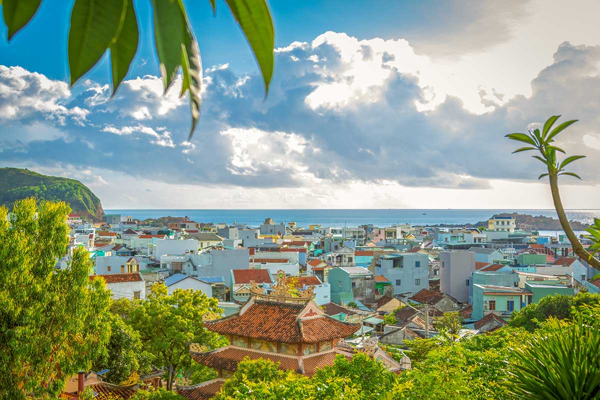 View over Nhon Hai Fishing Village – A colorful mix of tiled rooftops and houses with the South China Sea in the background, seen from a hillside above the village.