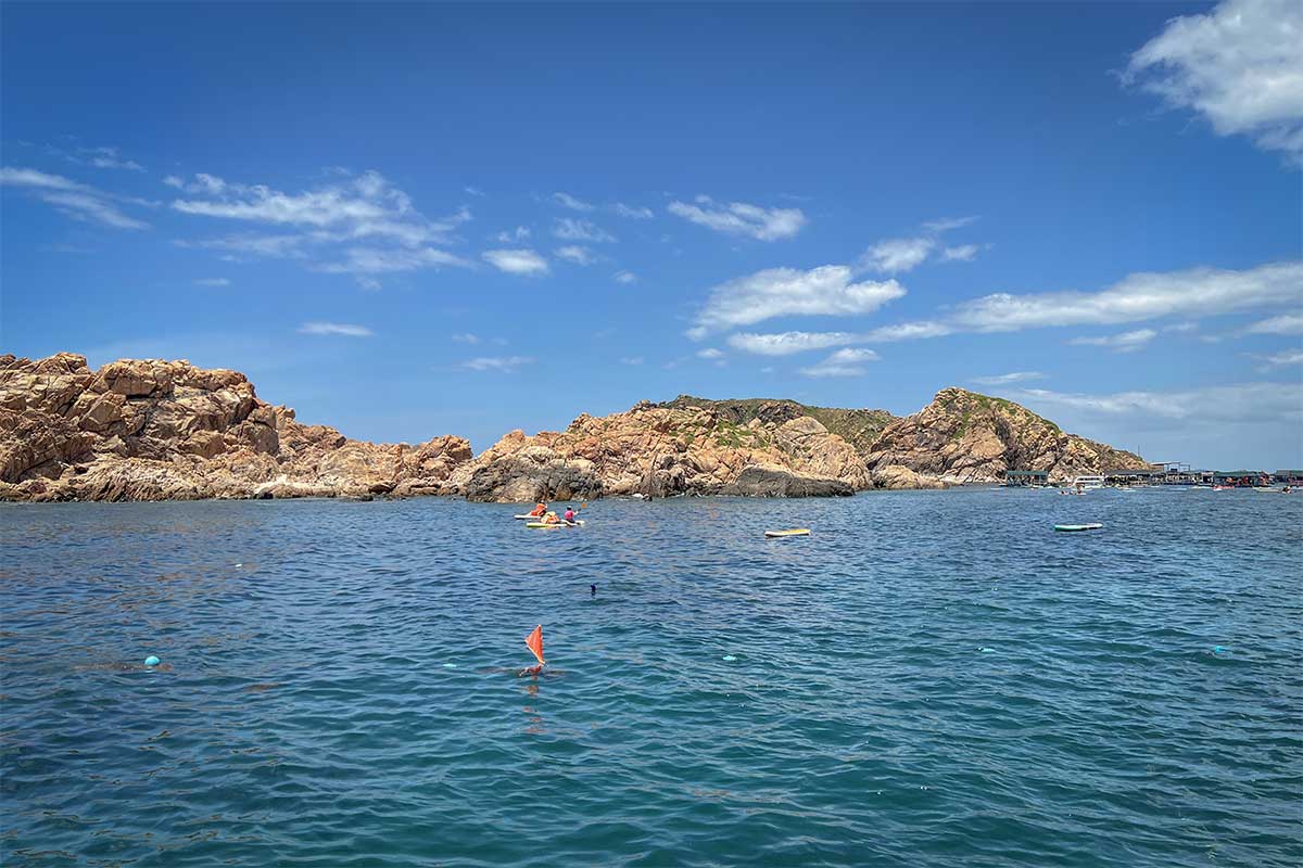 Kayaking near Hon Kho Island – Clear blue water and rocky cliffs make a scenic backdrop for visitors paddling kayaks just off the coast from Nhon Hai.