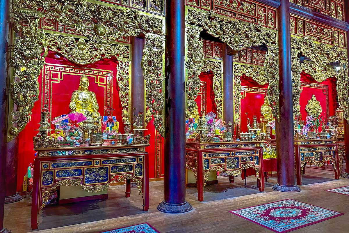 Ornate altar hall inside Tay Son Tam Kiet Temple at Quang Trung Museum, with golden statues and richly decorated carvings honoring the Tay Son brothers and their generals.