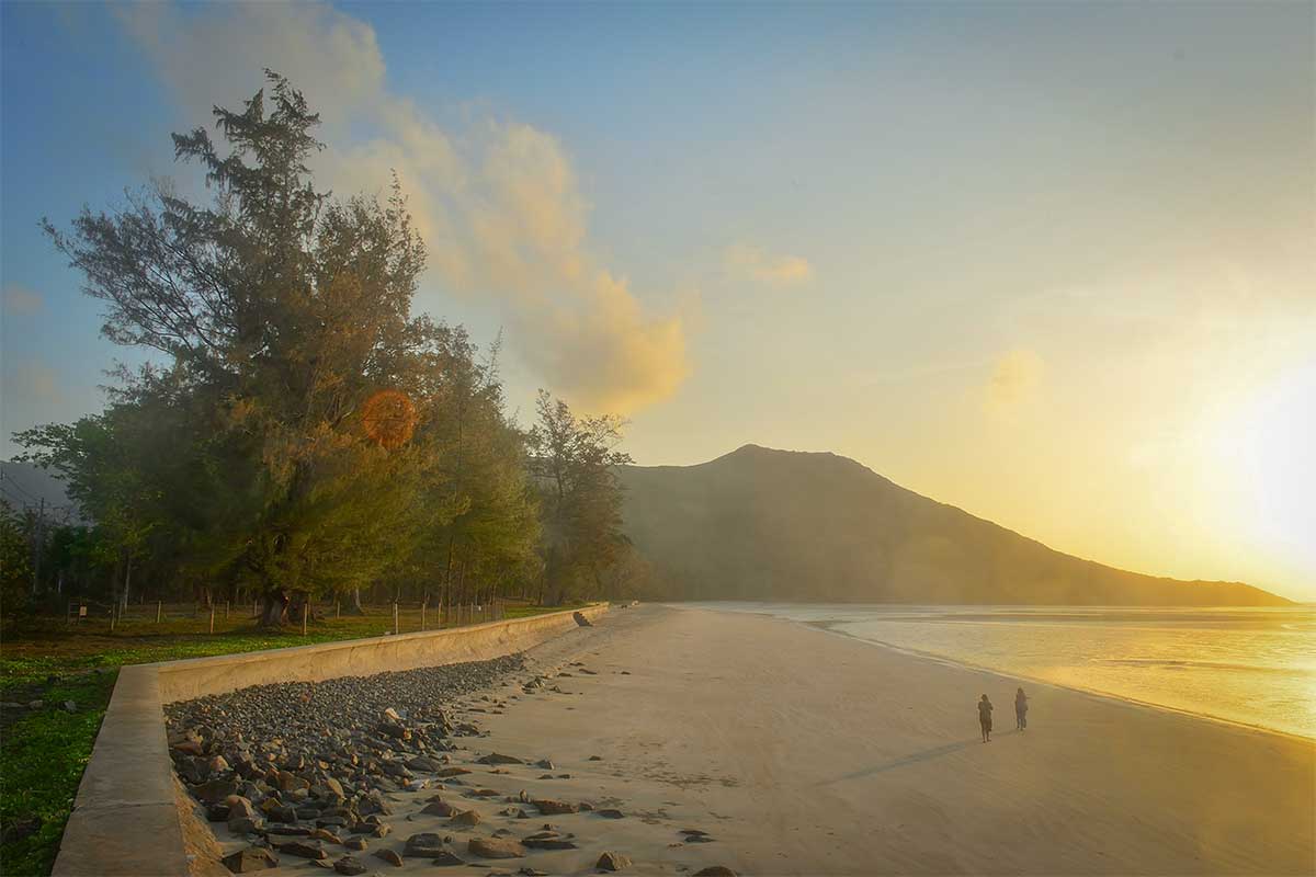 Dam Trau Beach is located on the west coast of Con Son, right next to the runway of the island’s airport. This gives it a unique character, as planes fly low over the beach when landing. It sounds busier than it actually is—Con Dao only has a limited number of flights per day.