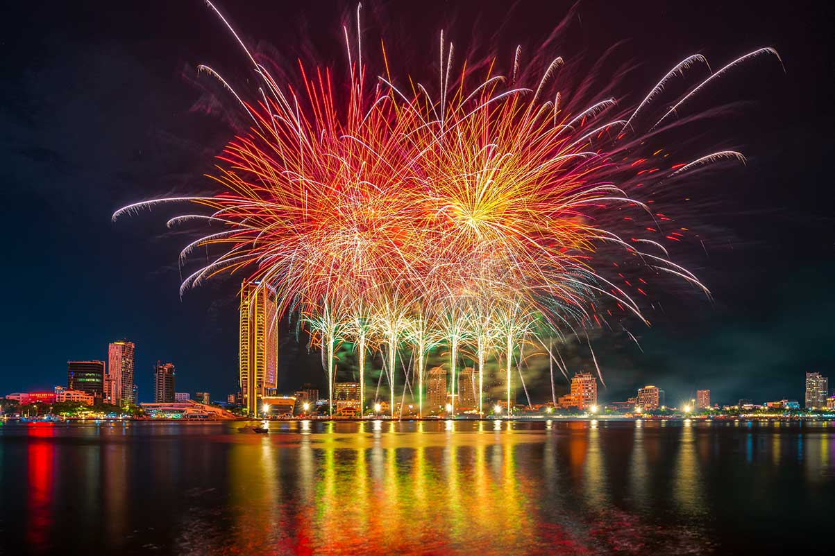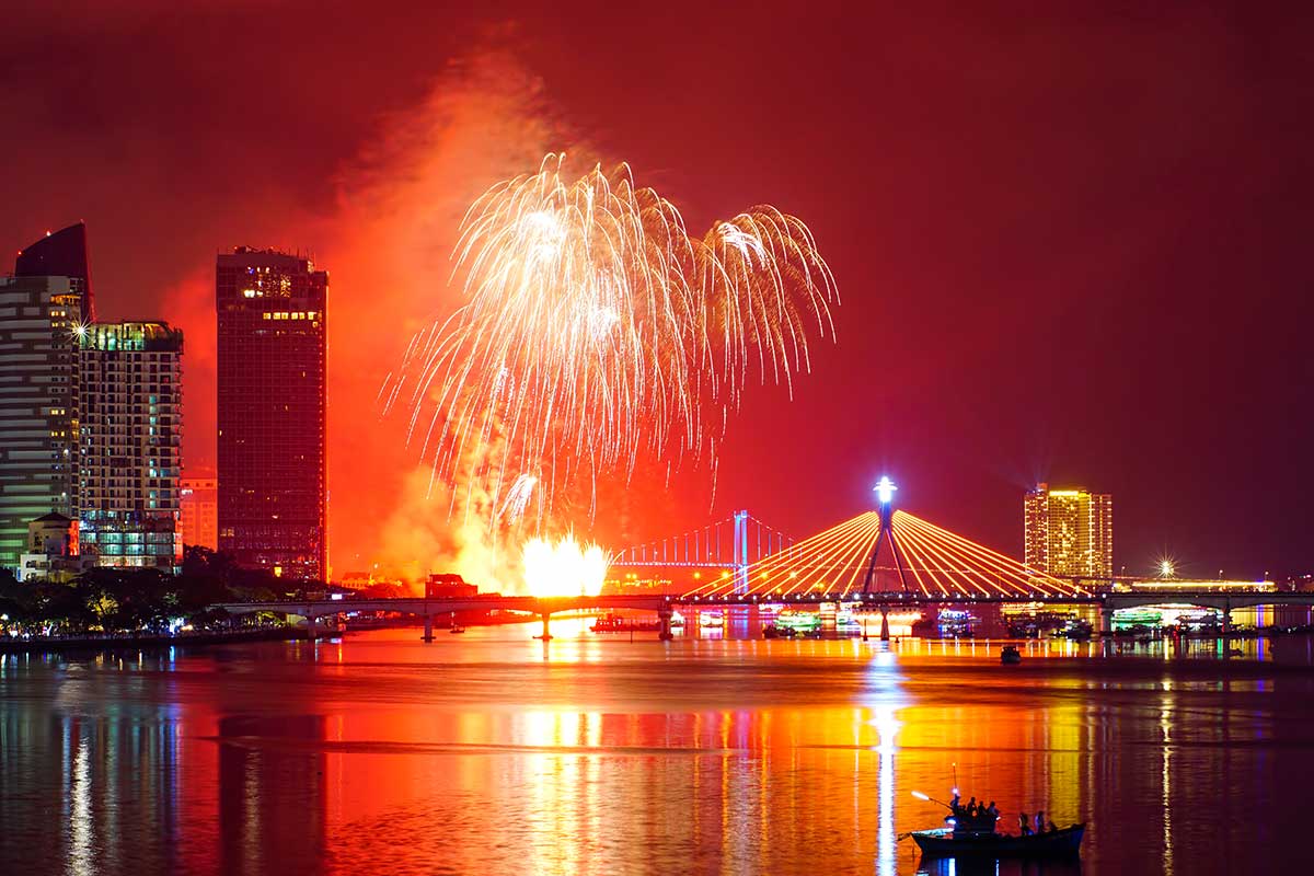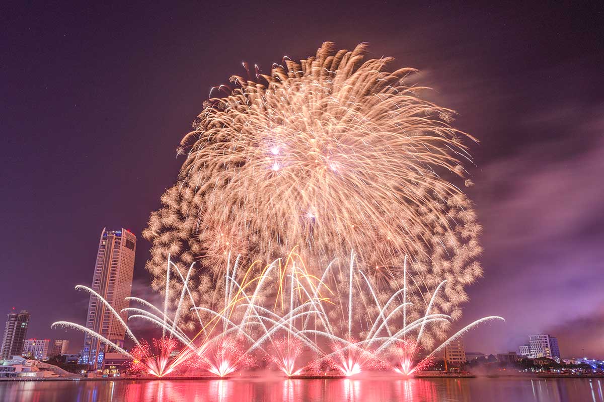 The Da Nang International Fireworks Festival (DIFF) is an annual fireworks competition where teams from different countries present choreographed pyrotechnic displays. Set against the Han River, the event takes place over several nights, drawing large crowds who gather along the riverbanks, bridges, and rooftop venues to watch the performances.