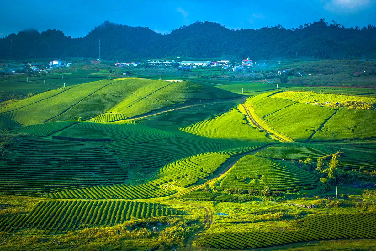 A larger plateau famous for tea plantations, flower seasons (plum blossoms in Jan–Feb), and waterfalls. Plenty of accommodation and food options. -> Read our full Moc Chau travel guide