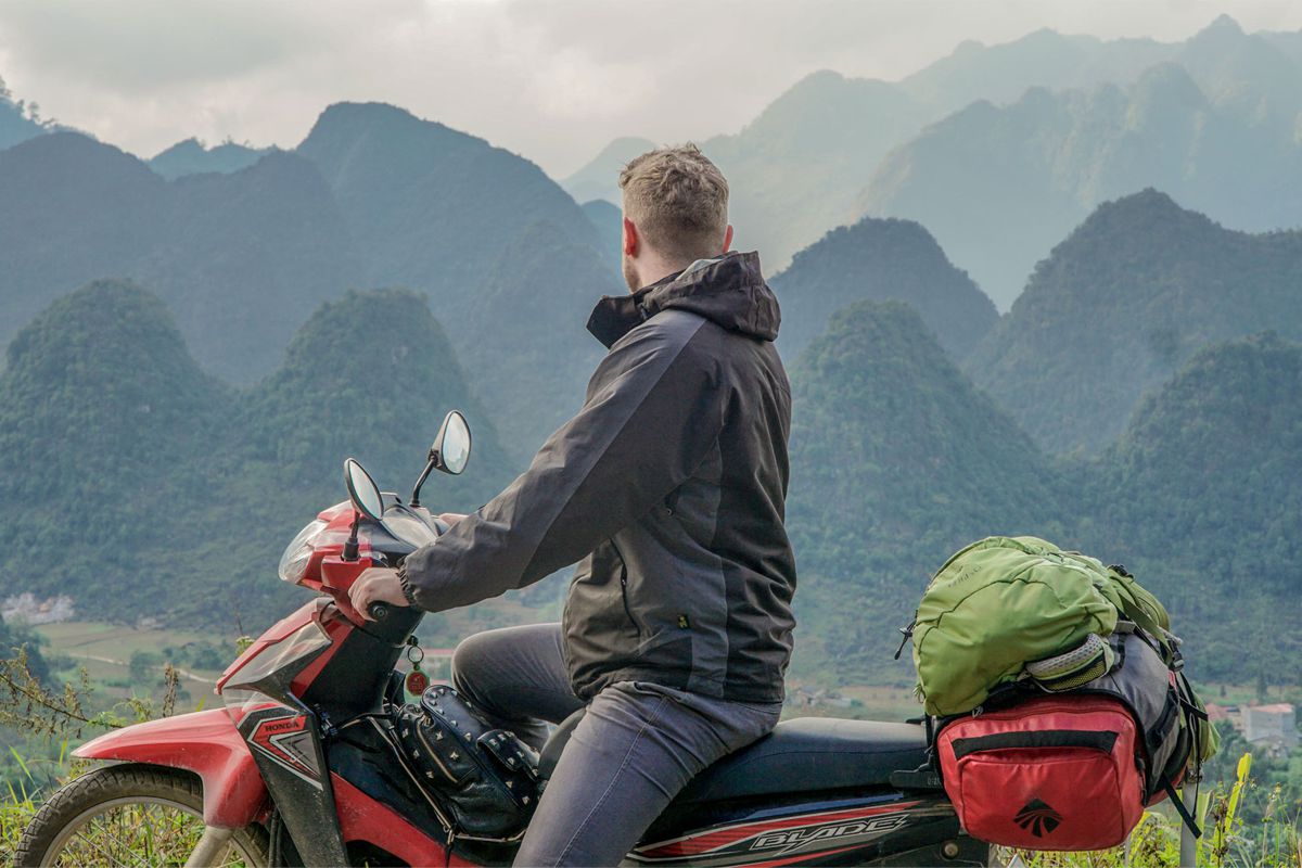 A man standing next to his motorbike on the Ha Giang Loop route, with a view of stunning mountain scenery, one of the best things to do in Vietnam.