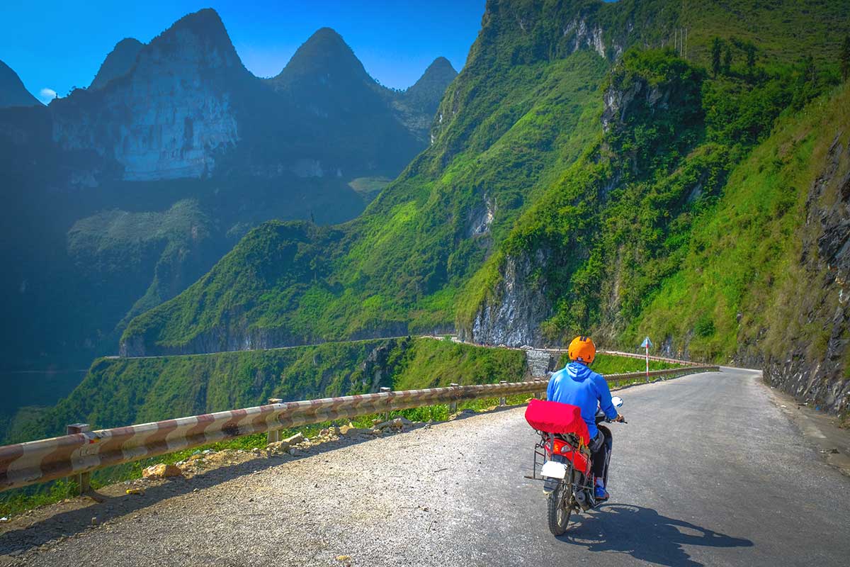 Ha Giang Loop motorbike tour with traveler on the back of an Easy Rider riding along a scenic mountain road