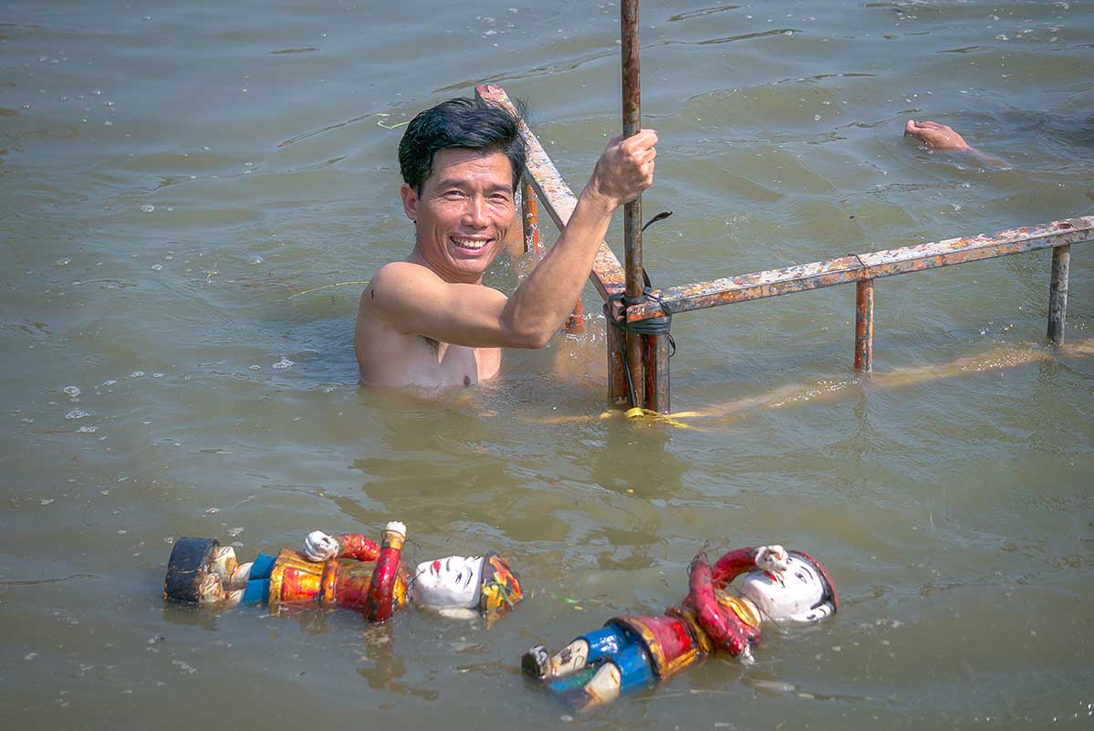 The shows are performed on water, with puppeteers standing waist-deep behind a screen. Using long bamboo poles and hidden string mechanisms, they control brightly painted wooden figures that appear to dance, fish, or fight dragons on the water’s surface. A live orchestra with drums, wooden bells, horns, and traditional singing adds rhythm and context, making the performance lively even if you don’t understand the language.