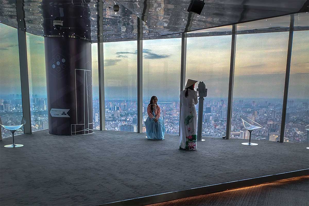 Two girls using fixed binoculars to see the streets and houses of Hanoi below at Lotte Observation Deck