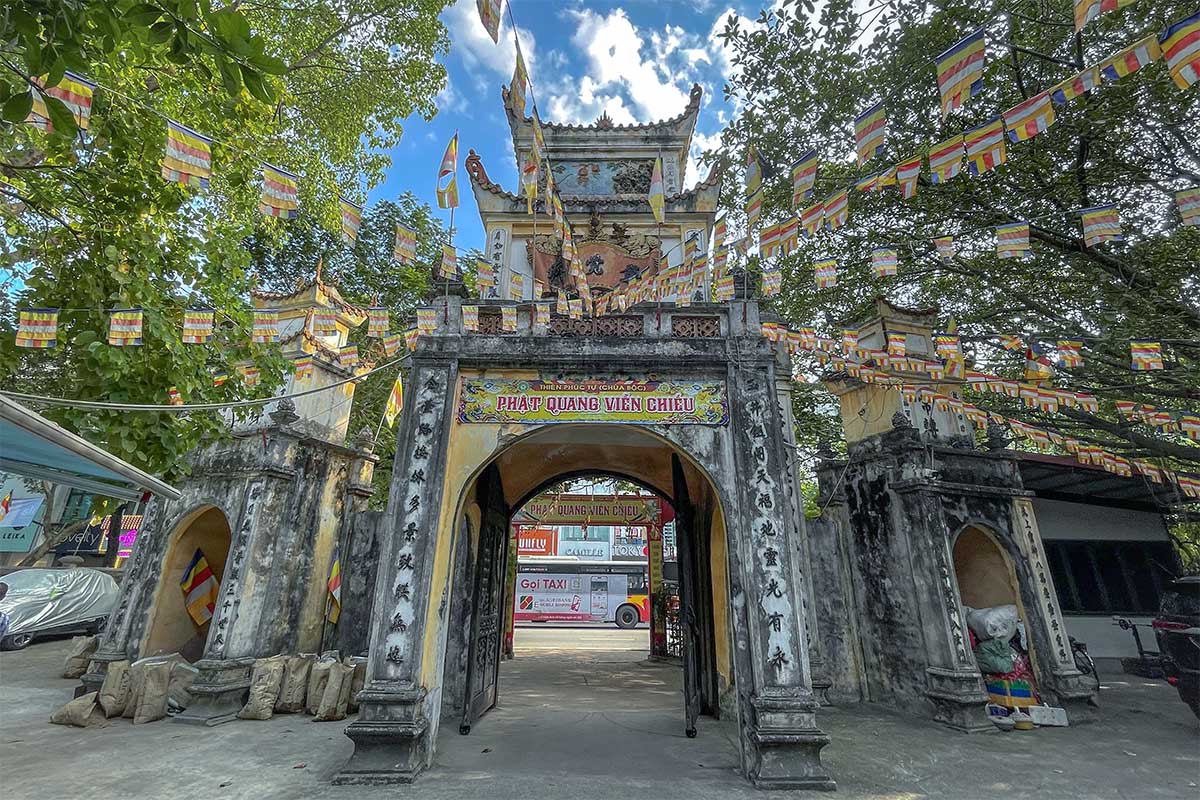 The entrance gate is a striking two-tiered arch topped with sun and sword motifs — a rare design detail in Hanoi’s pagodas. The swords point upward, symbolizing strength and victory, while a large sign reads “Thiên Phúc Tự,” the temple’s historic name.
