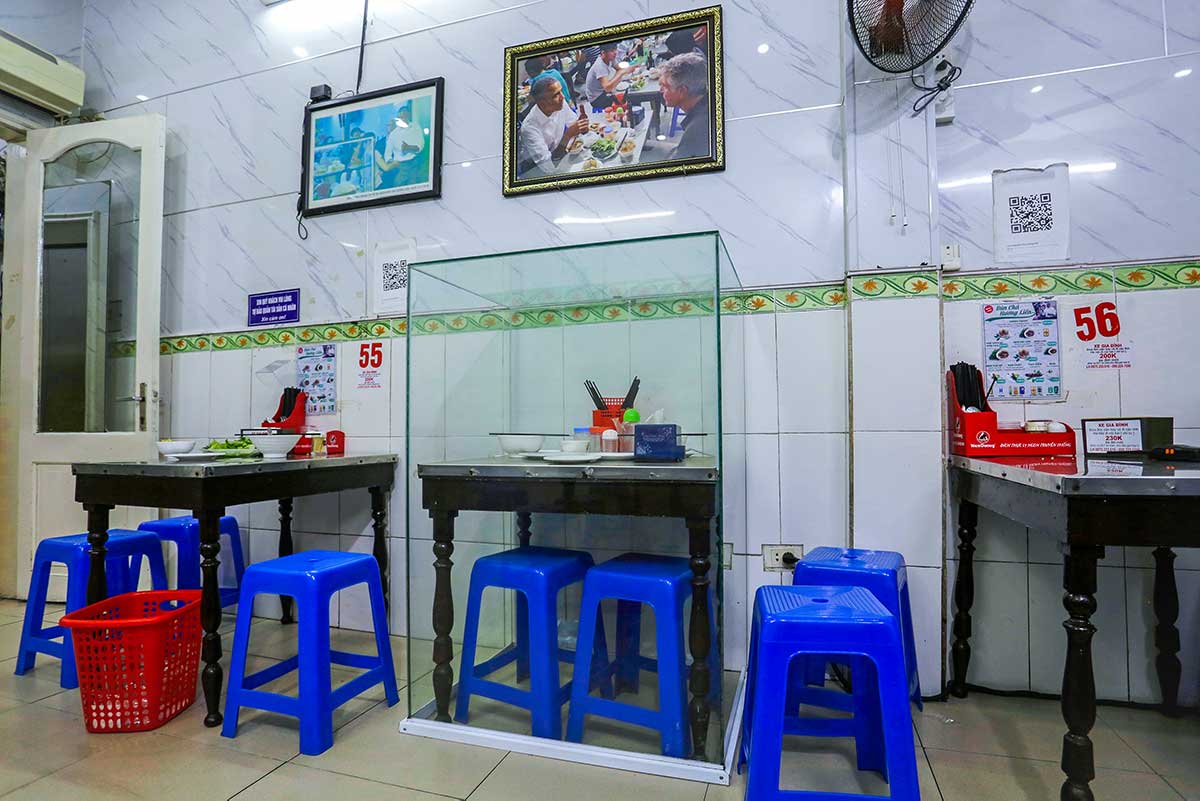 The layout is basic and functional: stainless steel tables, small plastic stools, tiled floors, and fluorescent lighting. Walls are decorated with framed photos of the Obama and Bourdain visit, along with media clippings that document the restaurant’s unlikely global moment.