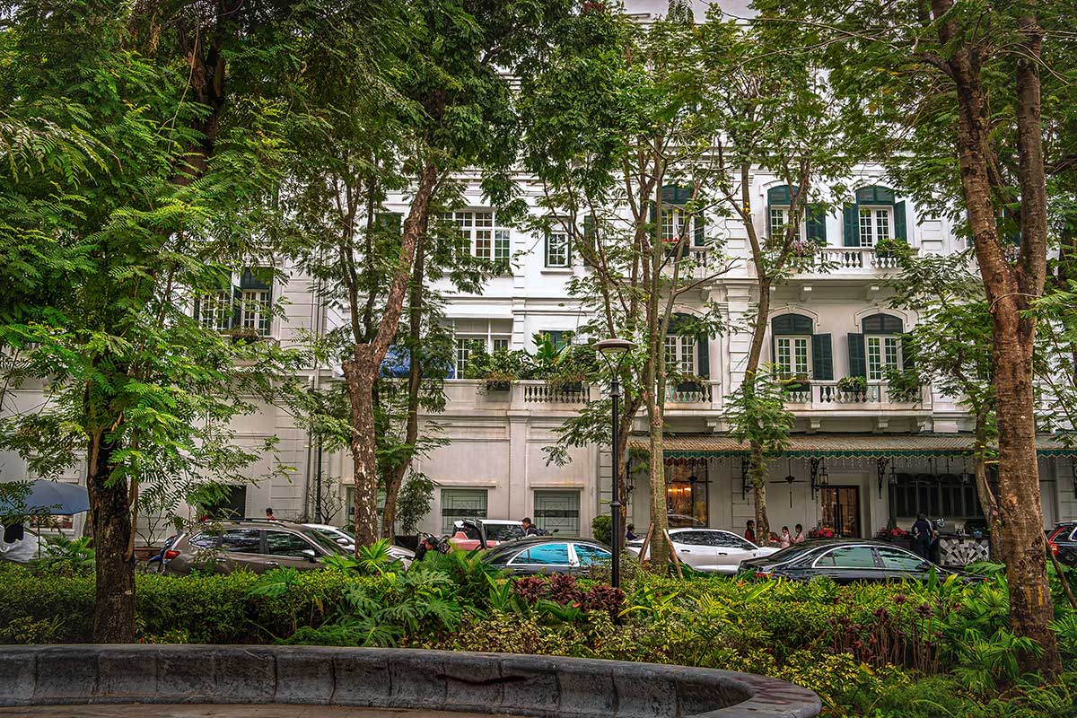 A French colonial building and street lined with trees in French Quarter Hanoi