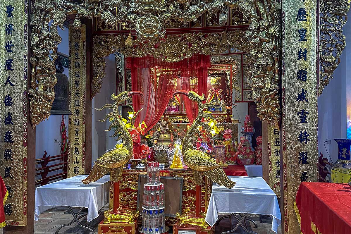 An altar with golden statues inside one of the temple buildings of Hai Ba Trung Temple