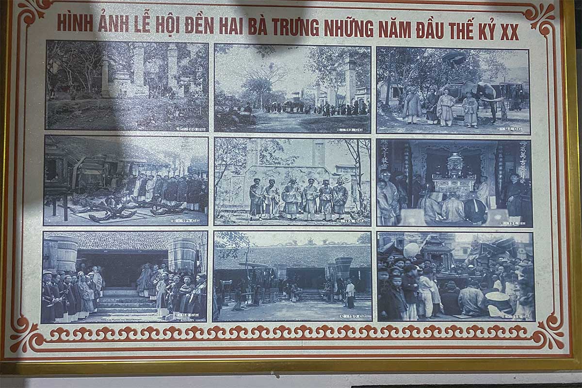 A few black and white photos of an event with elephants commemorating the Trung Sisters hanging in Hai Ba Trung Temple