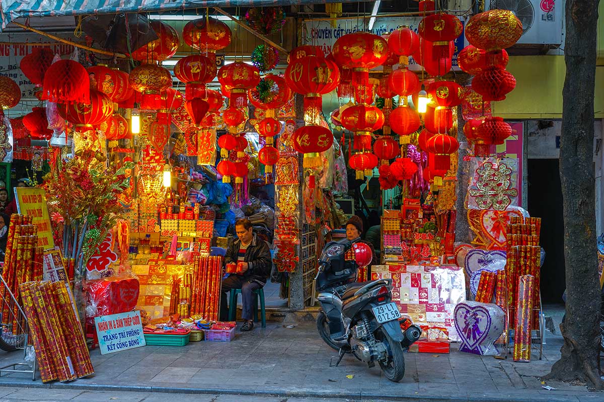 In the weeks leading up to Tet, the street becomes a flood of red and gold. You’ll see lucky banners, calligraphy, hanging ornaments, and stacks of votive paper. It’s visually overwhelming in the best way — but also the busiest time, with wall-to-wall shoppers and little room to move. Read more about: Vietnamese New Year in Hanoi.