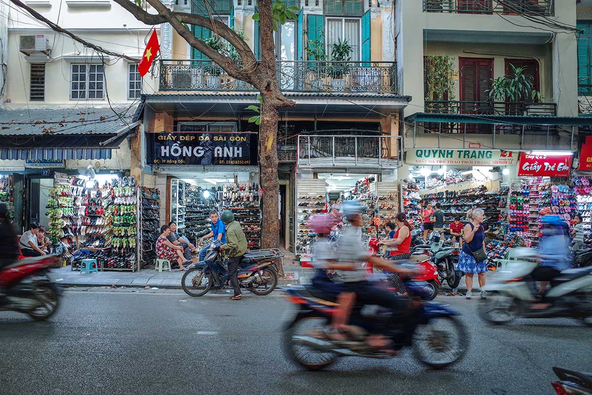 Hang Dau Street in Hanoi Old Quarter with several shoe shops right next to each other