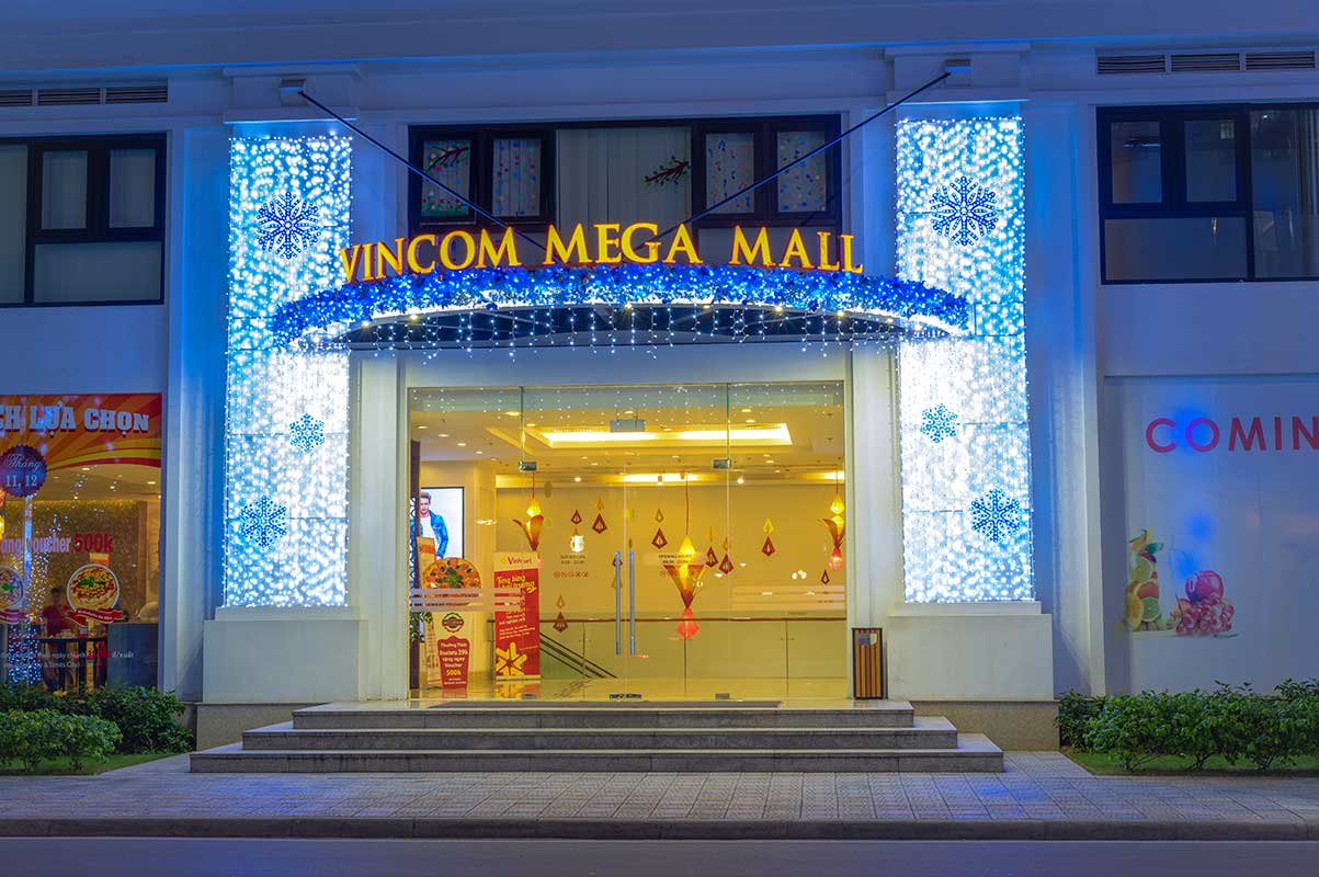 Vincom Mega Mall Royal City seen from outside at night in a mall that looks colonial style