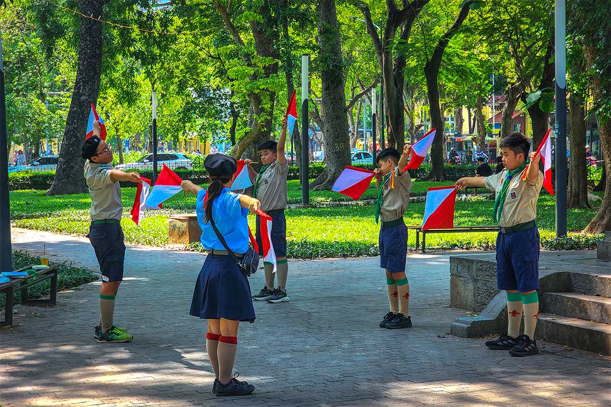 Girl and boy scouts practicing in Lenin Park in Hanoi