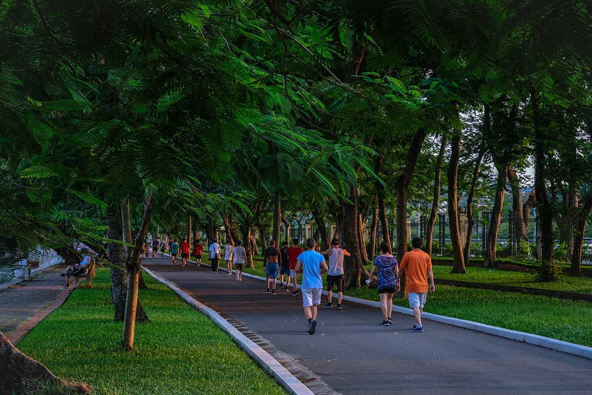 Come in the early morning or late afternoon, and you’ll find the park full of energy. Locals jog, stretch, dance, or join group aerobics sessions on the plazas. Others play badminton, walk their dogs, or just chat with friends under the trees.