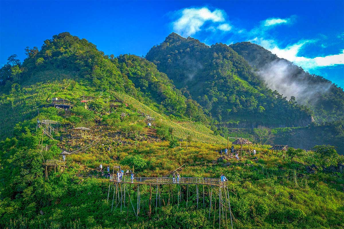 The local population is mostly Hmong, known for preserving traditional crafts such as embroidery, indigo dyeing, and beeswax painting. The landscape is dotted with tea hills, rocky limestone outcrops, and dense forests, offering a raw and rugged charm that feels far from the tourist crowds.