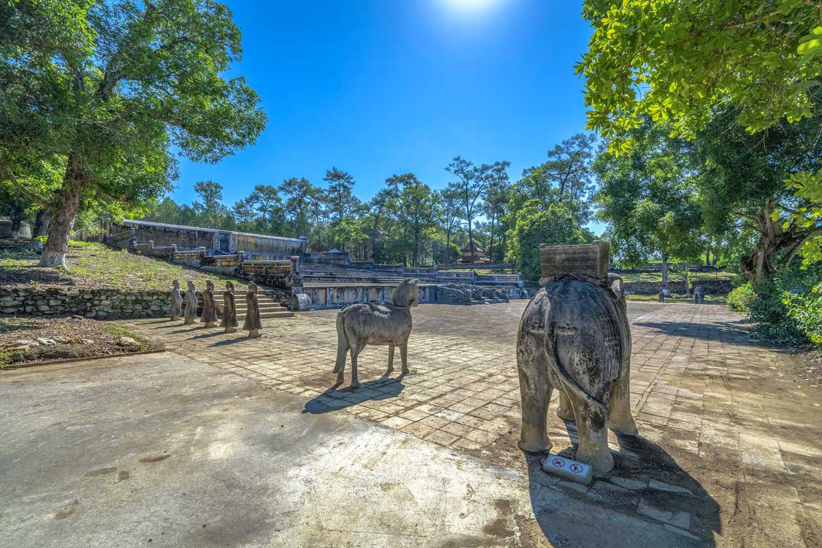 Approaching the central tombs, you’ll pass through a long paved courtyard lined with traditional stone statues of mandarins, elephants, and horses—symbolic protectors of the imperial soul. This ceremonial space, known as the Bái Đình, reflects Confucian hierarchy and the emperor’s eternal status. Despite being weathered by time, many of these statues remain intact and are striking in their scale and detail.