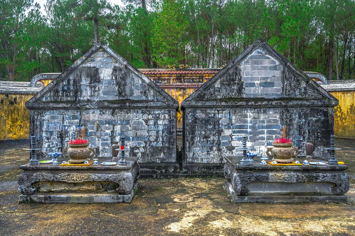 At the heart of the complex lie two nearly identical tombs—one for Gia Long and one for his wife, Empress Thừa Thiên. Built side by side on a raised terrace, they are symbolic of the emperor’s deep affection for his queen. Each tomb is enclosed by stone walls and features simple yet harmonious architecture, focused more on natural balance than royal display. This joint burial is rare among Hue’s royal mausoleums and makes the site feel more personal and human.