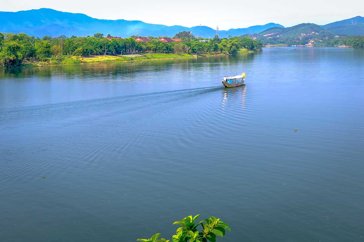 The Perfume River winds through Hue, lined with temples, gardens, and quiet stretches of countryside. Traditional dragon boats — long, brightly painted vessels — offer a relaxed way to take in the scenery from the water.