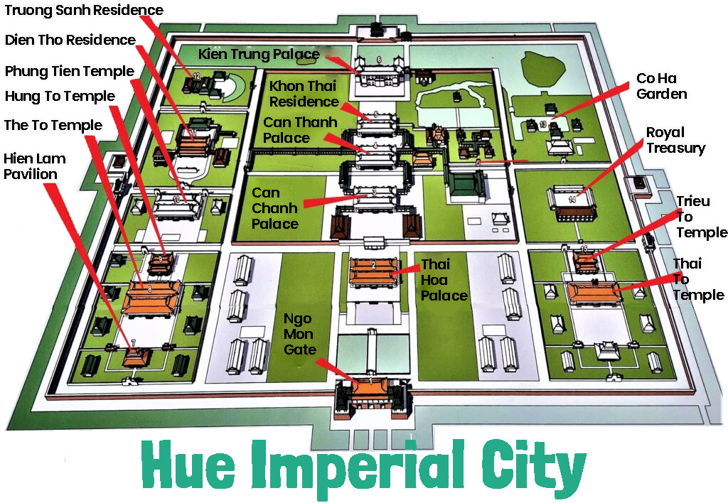 The Hue Imperial City is a large and complex site, so using a map helps make sense of its layout and highlights. Key landmarks are spread across different zones, and some restored buildings can be easy to miss without orientation. Below, we guide you through the main places to see on the map — and why they’re worth visiting.