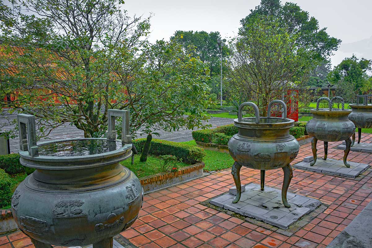 Just outside the To Mieu Temple stand the Nine Dynastic Urns (Cửu Đỉnh), cast in bronze between 1835 and 1837 under the reign of Emperor Minh Mang. These towering ceremonial urns — each over two meters tall and weighing around two tons — represent the nine emperors of the Nguyen dynasty up to that point.