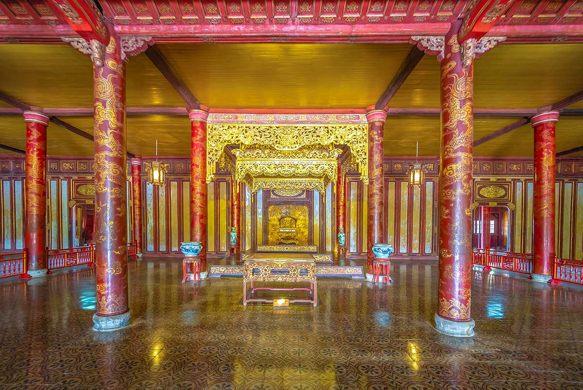 The palace itself is a masterpiece of traditional Vietnamese imperial architecture. Its two-tiered yellow-tiled roof is supported by 80 intricately carved wooden columns, all painted red and decorated with golden dragons, the symbol of imperial power. Inside, the focal point is the imperial throne, set on a raised platform beneath a richly decorated canopy.