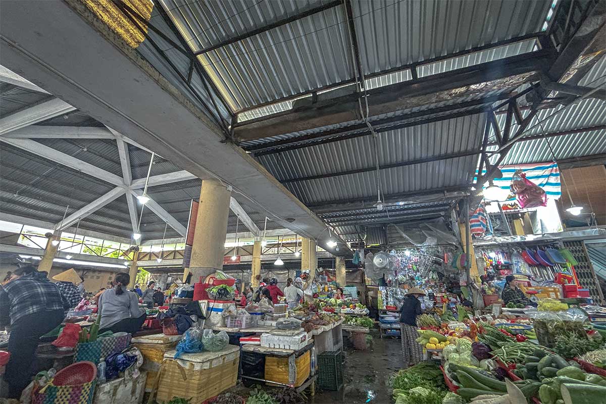 Inside Xep Market with fruit and vegetable stalls