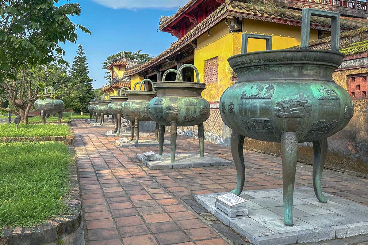 Symbolic meanings – In Confucian tradition, large bronze urns represent imperial legitimacy, stability, and the ruler’s connection to the land. Here, they also express the Nguyen Dynasty’s vision of a unified Vietnam, the permanence of its rule, and a deep respect for the natural world.