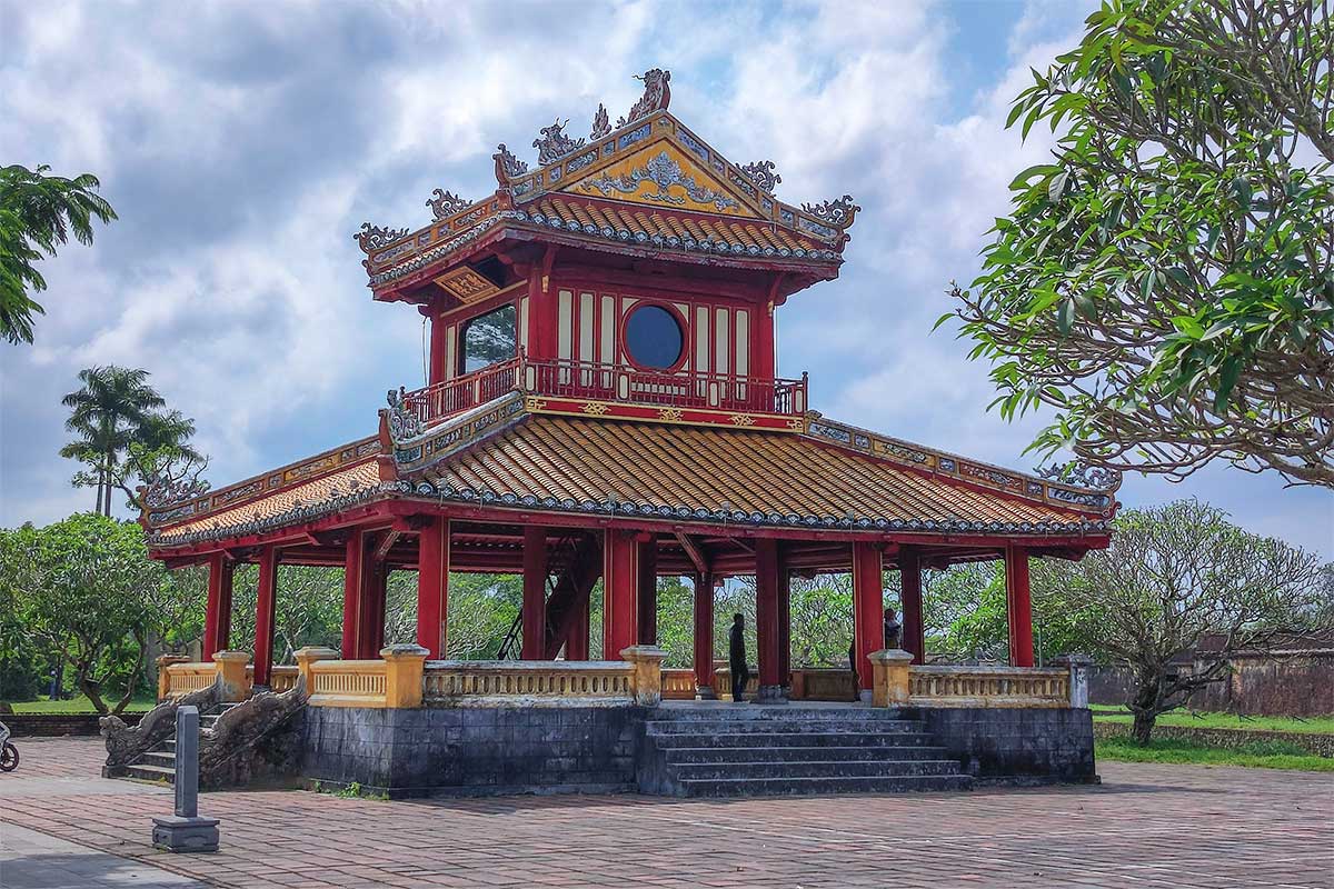 The pavilion sits just outside the Imperial Citadel’s main entrance, directly facing the Flag Tower and the Perfume River. Its prominent location made it both a practical place for proclamations and a symbolic link between the royal court and the people of Hue.