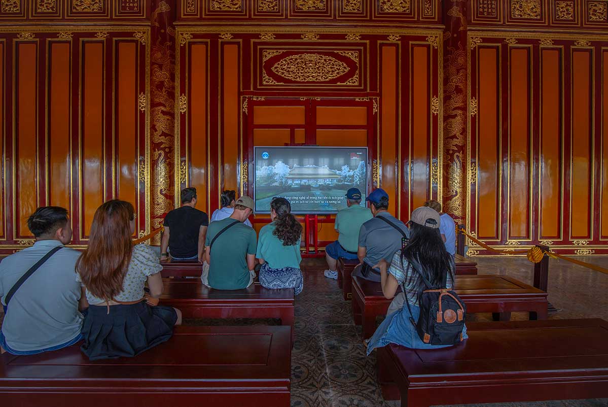 A small screening area showing the history and restoration of Thai Hoa Palace within the palace itself