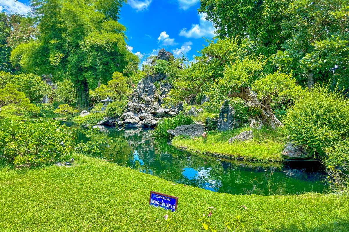 The grounds of the pagoda are filled with bonsai trees, flowering plants, and quiet walking paths. It’s a peaceful place to take a break from the city. Early in the morning or late in the day, the garden feels especially calm, with river breezes and distant chanting from the monastery.