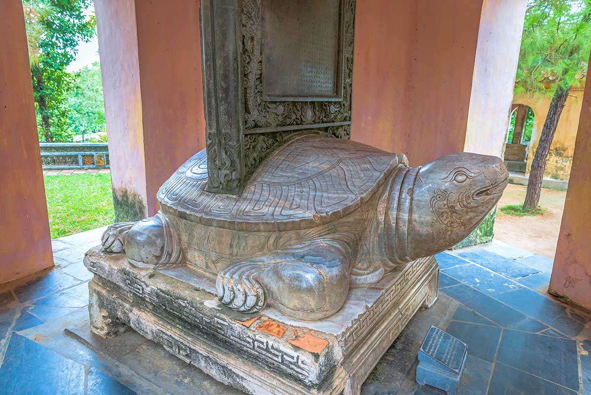 Near the bell tower is a small open-sided structure housing a stone stele placed on the back of a carved marble turtle, a Vietnamese symbol of longevity. The stele dates to 1715 and records the history and cultural significance of the pagoda. It’s a subtle but important artifact of the Nguyen Dynasty’s support for Buddhism.