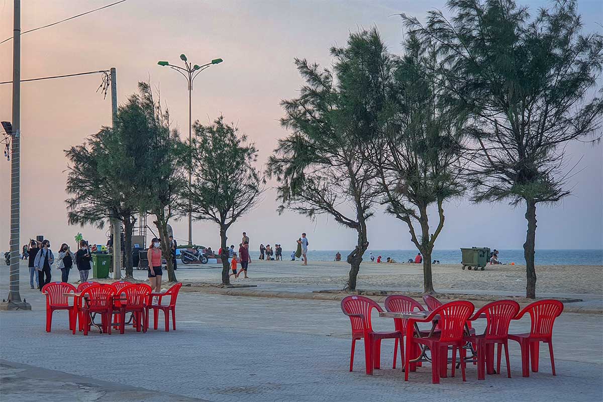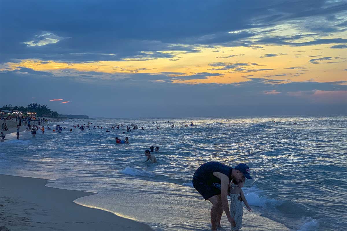 The atmosphere shifts depending on the time of day: mornings can be quiet with only a few fishermen around, while late afternoons see families and groups of locals gathering to cool off and enjoy the sea breeze. Foreign visitors should keep expectations realistic — this is not a postcard-perfect beach like Da Nang or Hoi An, and pollution or trash on the sand is sometimes an issue.