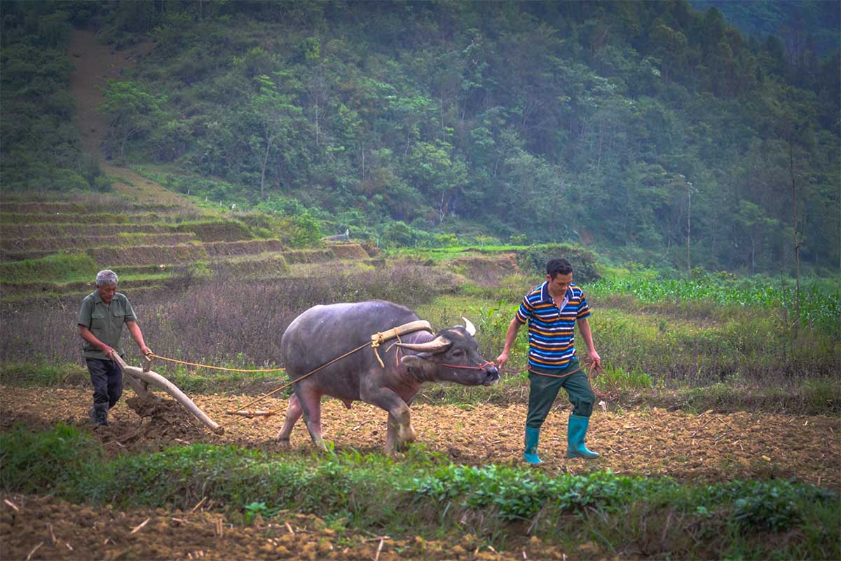 Two man are plowing land with a buffalo near Ban Pho Village in Bac Ha