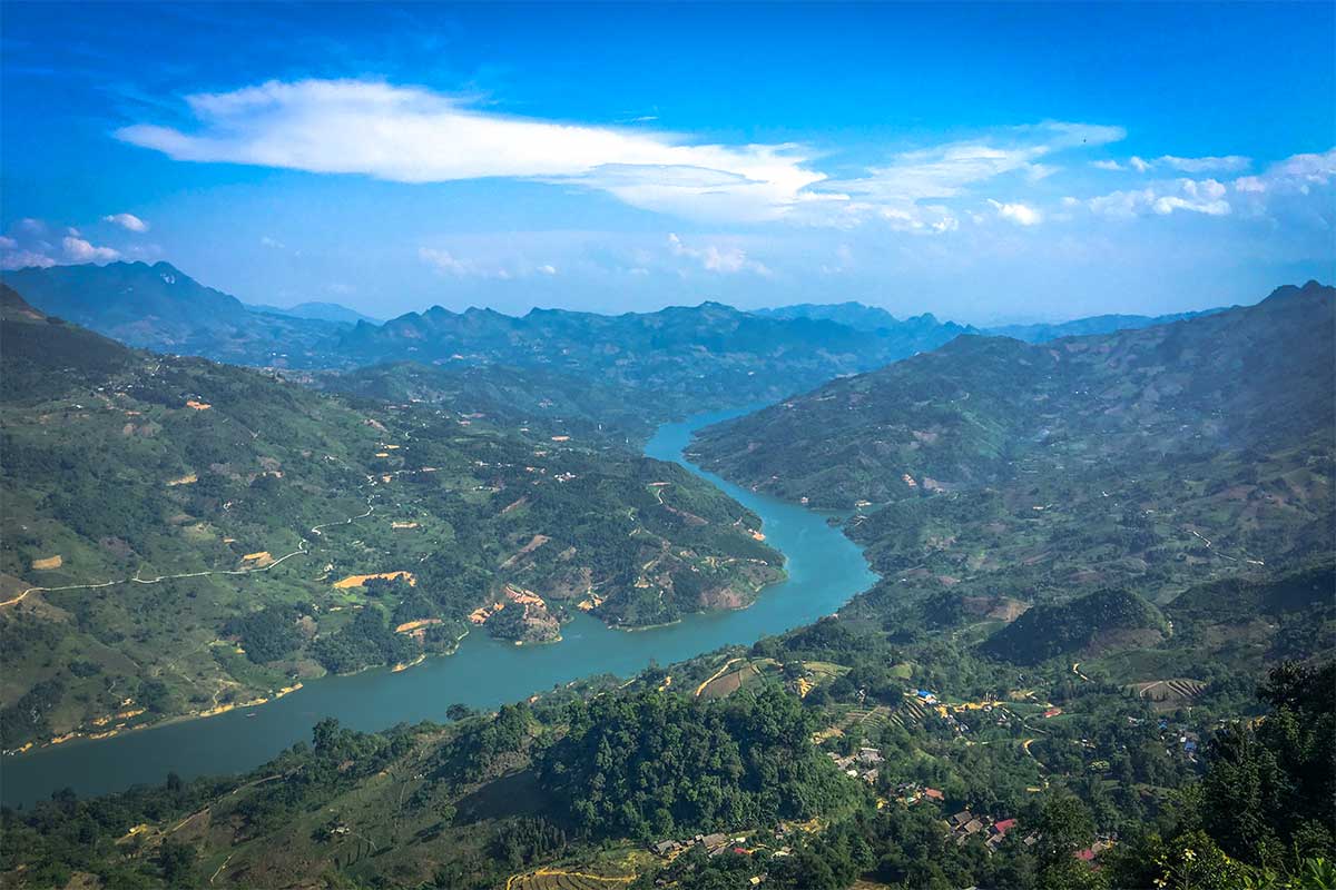 A view from high up over the mountains and deep down the Chay River in Bac Ha District