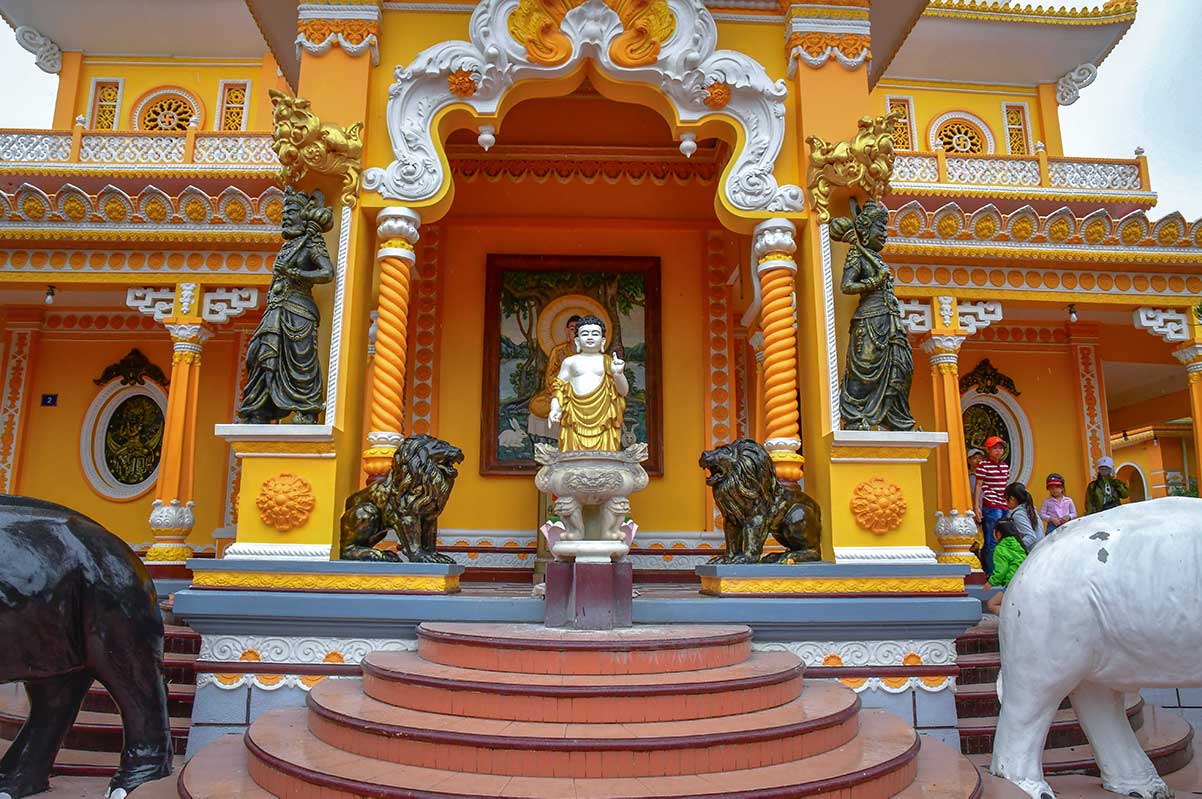 Built in 1847 and later restored, Tay An Pagoda mixes Vietnamese, Indian, Cham, and Chinese styles in a colorful way. Two elephant statues — one black, one white — stand at the entrance, making it instantly recognizable. Inside, the halls are packed with hundreds of wooden figures, ranging from serene Buddhas to fierce-looking generals. For many visitors it feels fascinating, though also a little chaotic compared to the calmer pagodas elsewhere in Vietnam.
