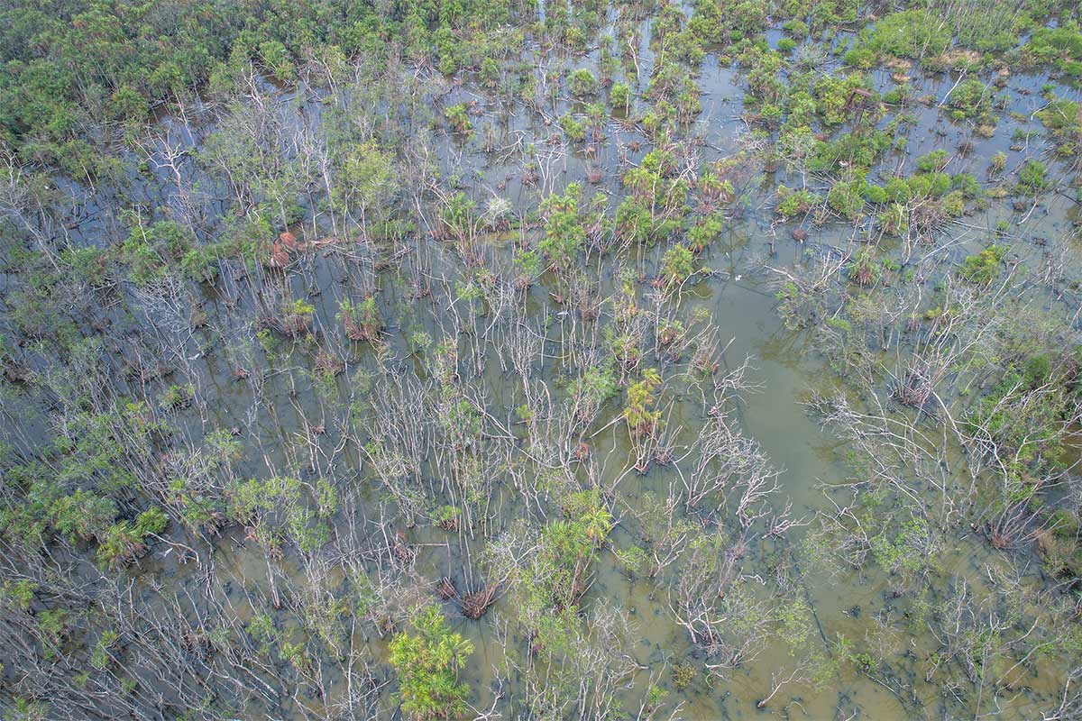 The landscape is dominated by mangrove species, bamboo groves, and a large population of date palms, which provide important nesting sites for storks and herons. The dense vegetation creates a layered habitat where different species occupy different levels of the forest, from treetop nesting storks to owls sheltering in lower branches. This mix of wildlife and vegetation gives the sanctuary its ecological value, though for visitors the main draw remains the seasonal flocks of birds.