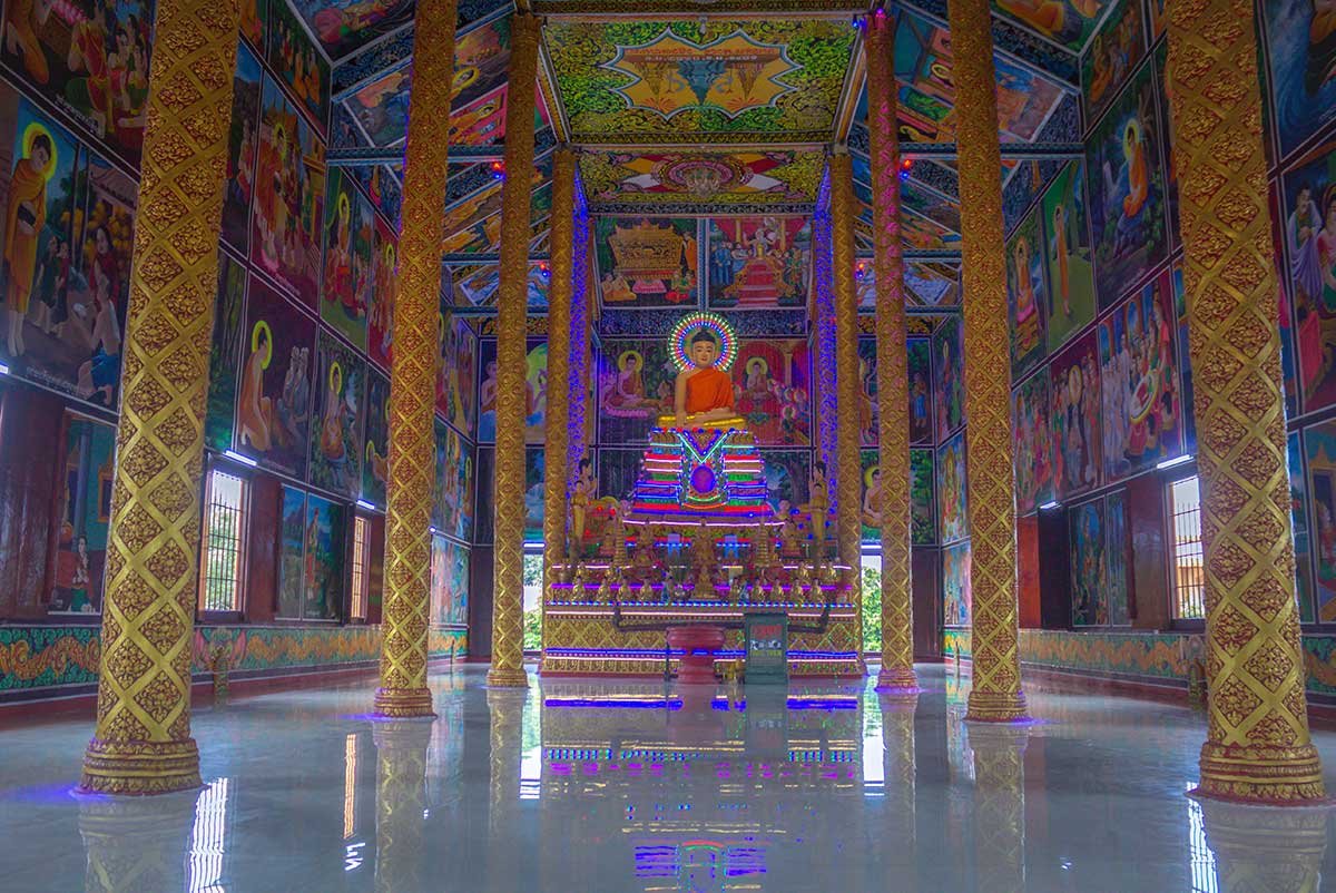 Opposite the main hall lies a garden-like area with stupas and Buddha statues in different meditation postures. Many of the stupas hold the ashes of monks, reflecting the Khmer Buddhist tradition of honoring the deceased within temple grounds. Combined with the colorful patterns and greenery, it’s a quieter area of the pagoda to explore at your own pace.