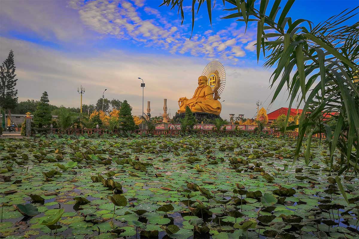 Van Phuoc Pagoda is hard to miss if you’re in the area—giant statues, golden gates, and a skyline dominated by a 54-meter Avalokitesvara make it one of the most visually striking pagodas in the Mekong Delta. The scale alone can feel impressive, and for photography it certainly delivers. The grounds are spacious, dotted with ponds, bridges, and shrines, which give visitors plenty to look at and walk around.
