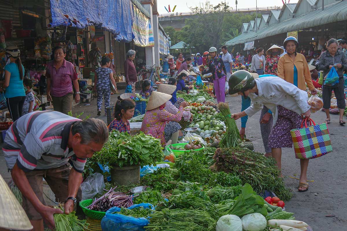 The structure combines colonial design with traditional touches: arched windows, tiled roofs, and a riverside setting that comes alive at night under the lights. It’s not as polished or dramatic as Hoi An’s old town markets, but it does have a quiet charm if you take the time to notice. Inside, the atmosphere is less romantic and more down-to-earth: narrow walkways, local chatter, and stalls stacked with everything from fruit to household items.