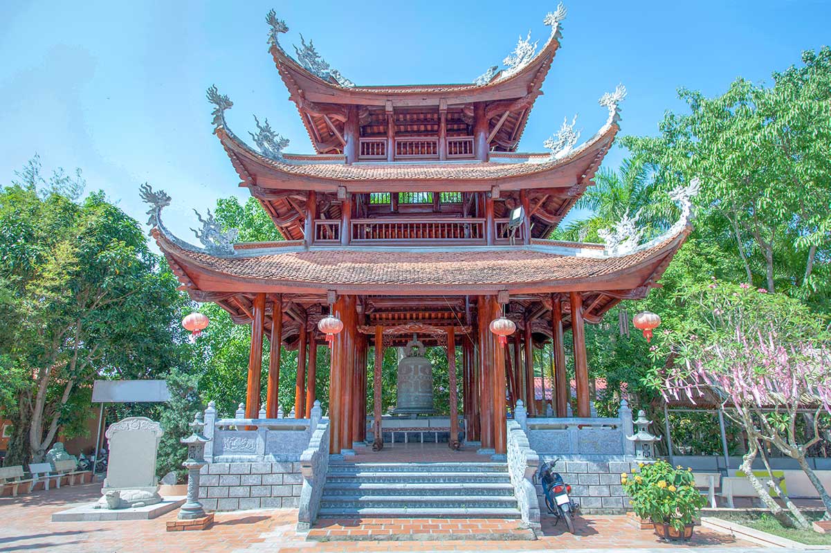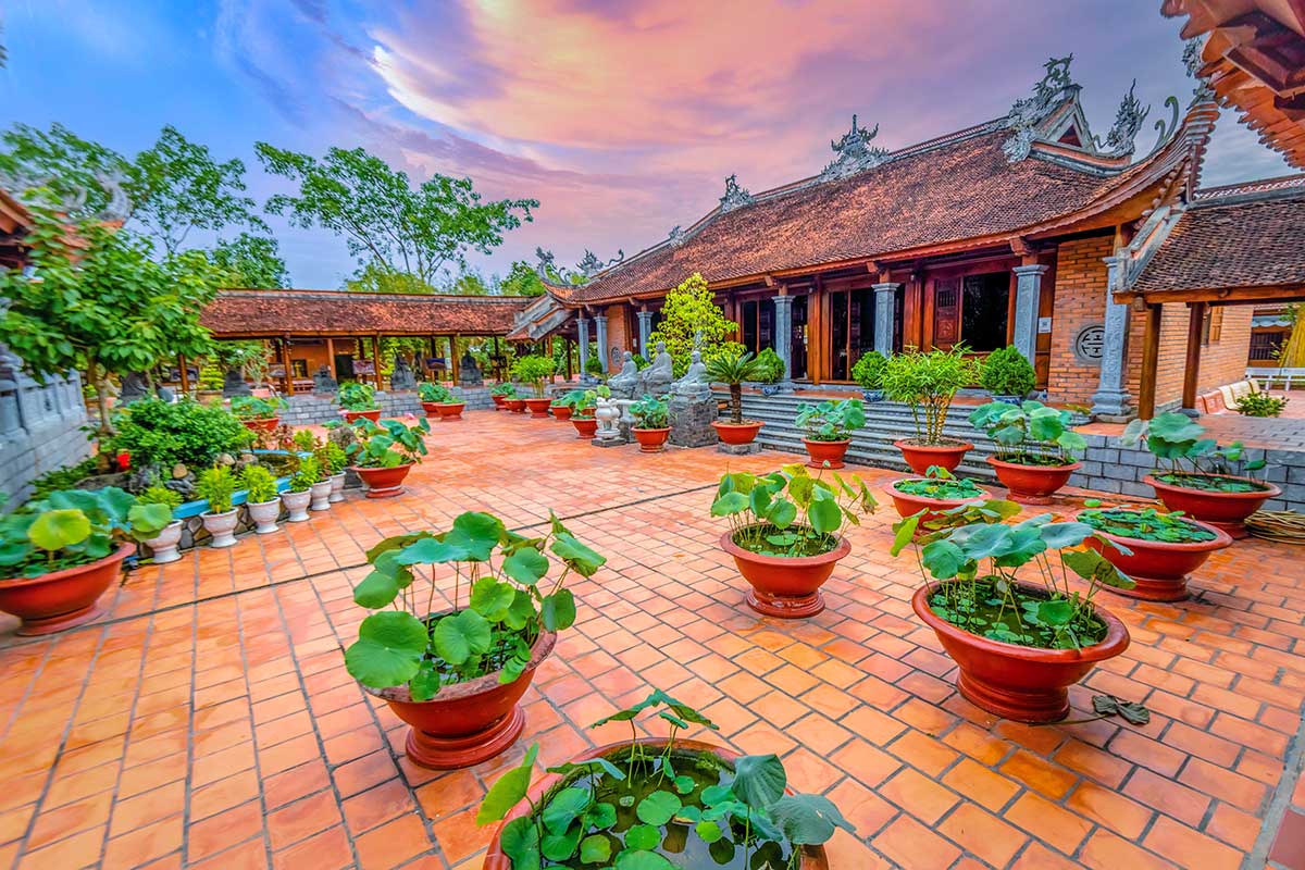 The main hall is the most impressive building in the complex. At its center sits a 3.5-ton bronze statue of Shakyamuni Buddha in a meditative pose, flanked by statues of Bodhisattvas. The structure itself reflects Tran dynasty architecture, supported by massive ironwood pillars that give the space a solemn and dignified atmosphere.