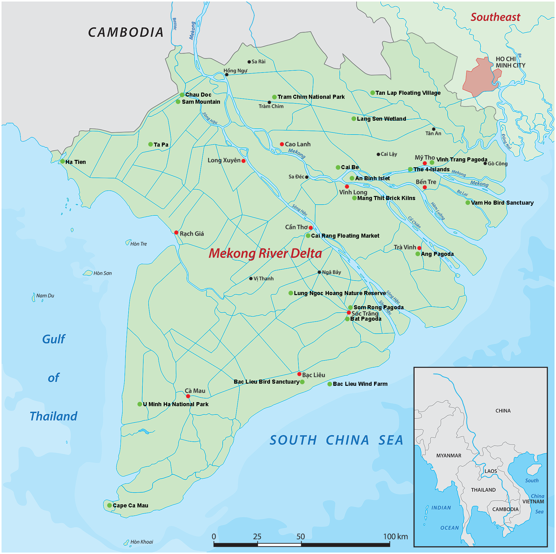 Map of Mekong Delta with the best sights