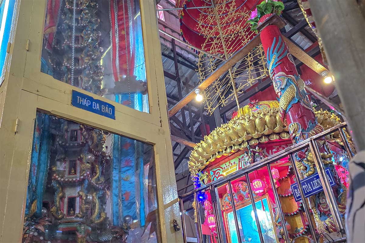 Another standout is the Da Bao Tower, built by Ngo Kim Tong in 1939 when he was only 30 years old. It rises about four meters high with 13 tiers, each level containing small niches with Buddha statues. In total, the tower has 208 doors and 156 winding dragons worked into its design. It feels almost like a miniature pagoda inside the temple, and it’s one of the most intricate pieces on display.
