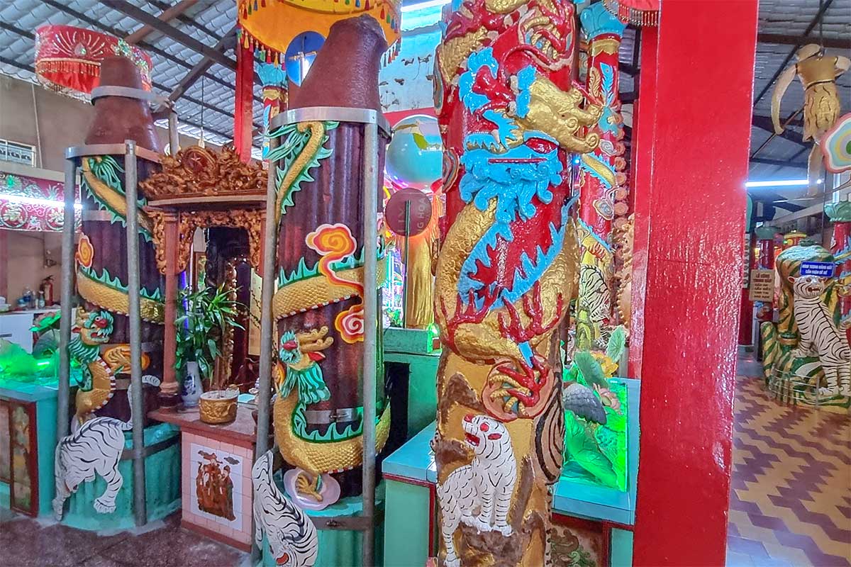 The main hall of Clay Pagoda is painted bright yellow with red details, dragon pillars, and hanging lanterns. It may look modest compared to grand Khmer temples in Soc Trang, but its colorful façade and dragon motifs make for a striking entrance. This is where most visitors enter before exploring the interior highlights.