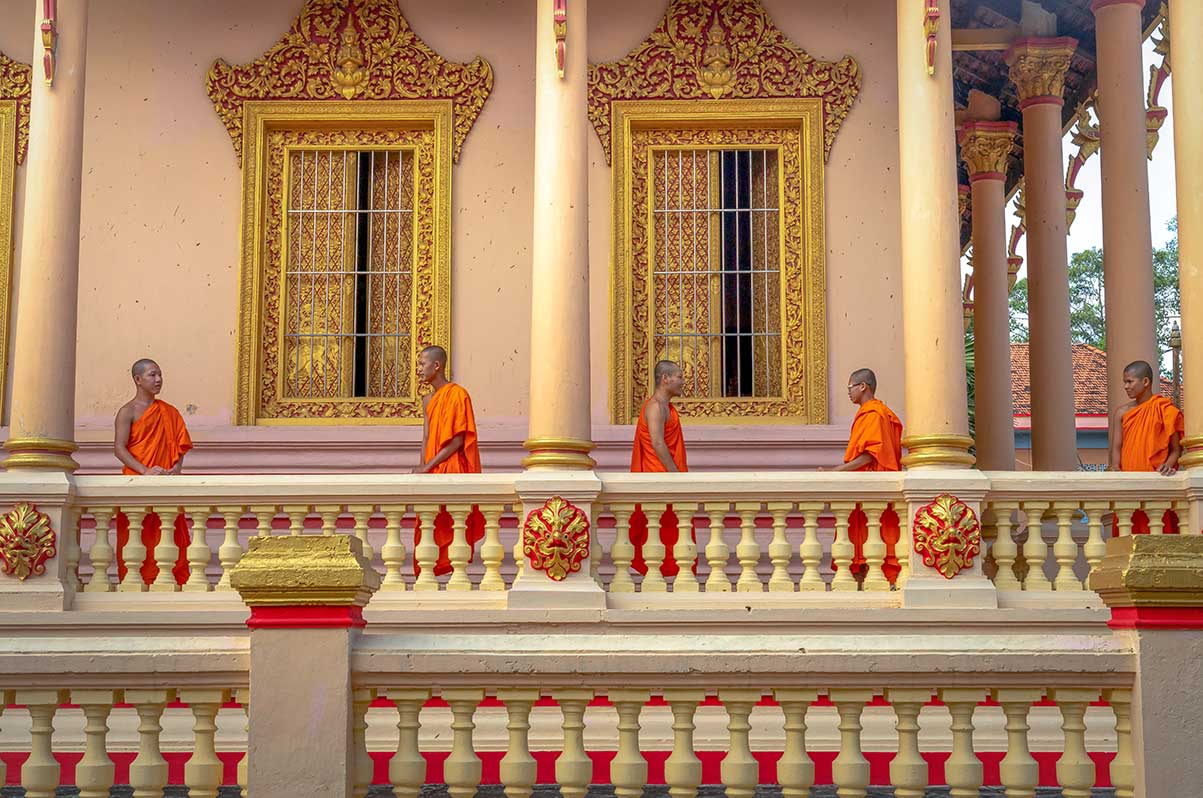Kh’leang Pagoda is not just a monument — it is home to an active Khmer monastic community. Monks and novices in bright orange robes can often be seen studying, chanting, or simply tending to the grounds. For many visitors, this is one of the most striking experiences: seeing monks in Cambodia- and Thailand-style robes within Vietnam, highlighting how unique the Khmer cultural presence is here. During summer, the sight of children learning in classrooms adds another layer of authenticity to the pagoda’s daily life.