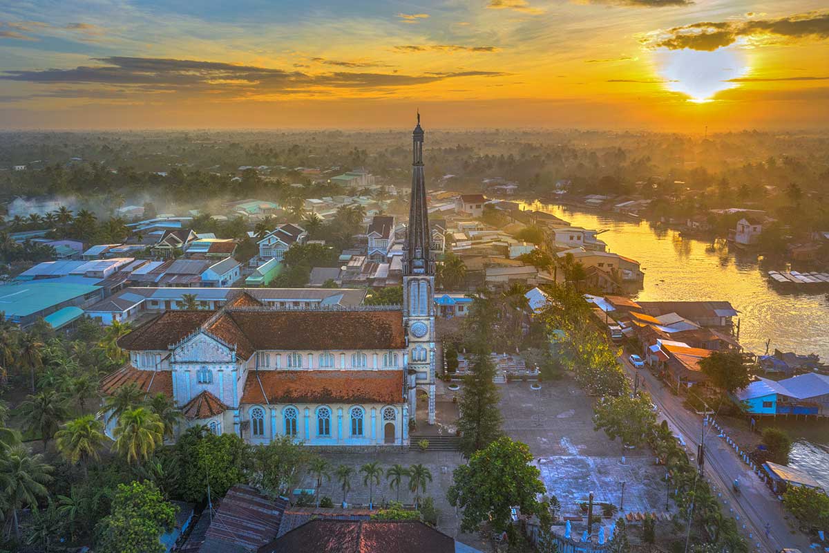 The church’s most striking feature is its bell tower, the tallest in the Mekong Delta, housing four bronze bells cast in France in 1931. The façade facing the river is decorated with carved vine patterns and topped by a statue of the Virgin Mary, making it especially photogenic when seen from a boat on the Cai Be floating market side.