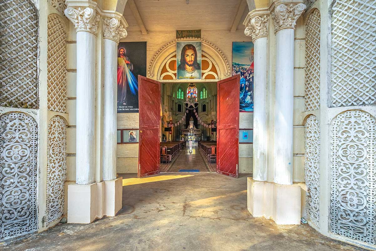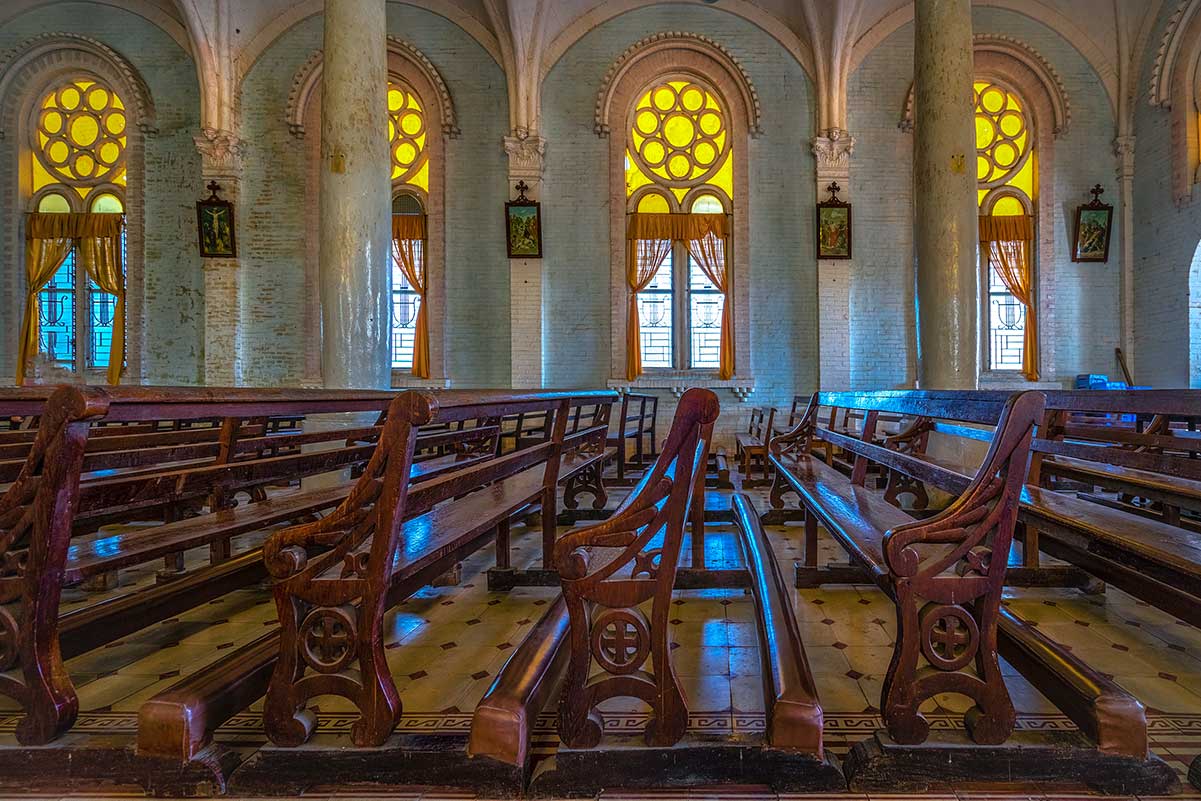 Neatly arranged rows of pews line the nave, giving the space a sense of order and reverence. While the design is impressive, it’s worth noting that the interior can get very hot during the day since there are no fans or air-conditioning. Visitors often find the atmosphere beautiful but a little uncomfortable in the Mekong Delta heat.