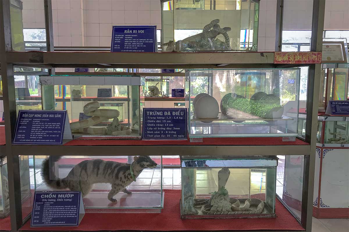 A small indoor section presents preserved specimens of dozens of Vietnamese snake species. While the displays are dated, they are often more informative than the outdoor enclosures, with clearer labeling and a broader overview of Vietnam’s snake diversity.